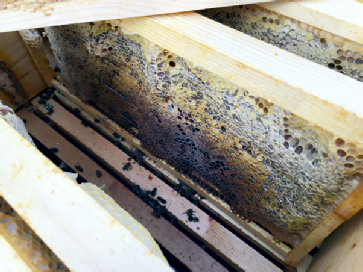 - No moisture in the hive body and a small amount of mold near the bottom of a couple frames in lower box,